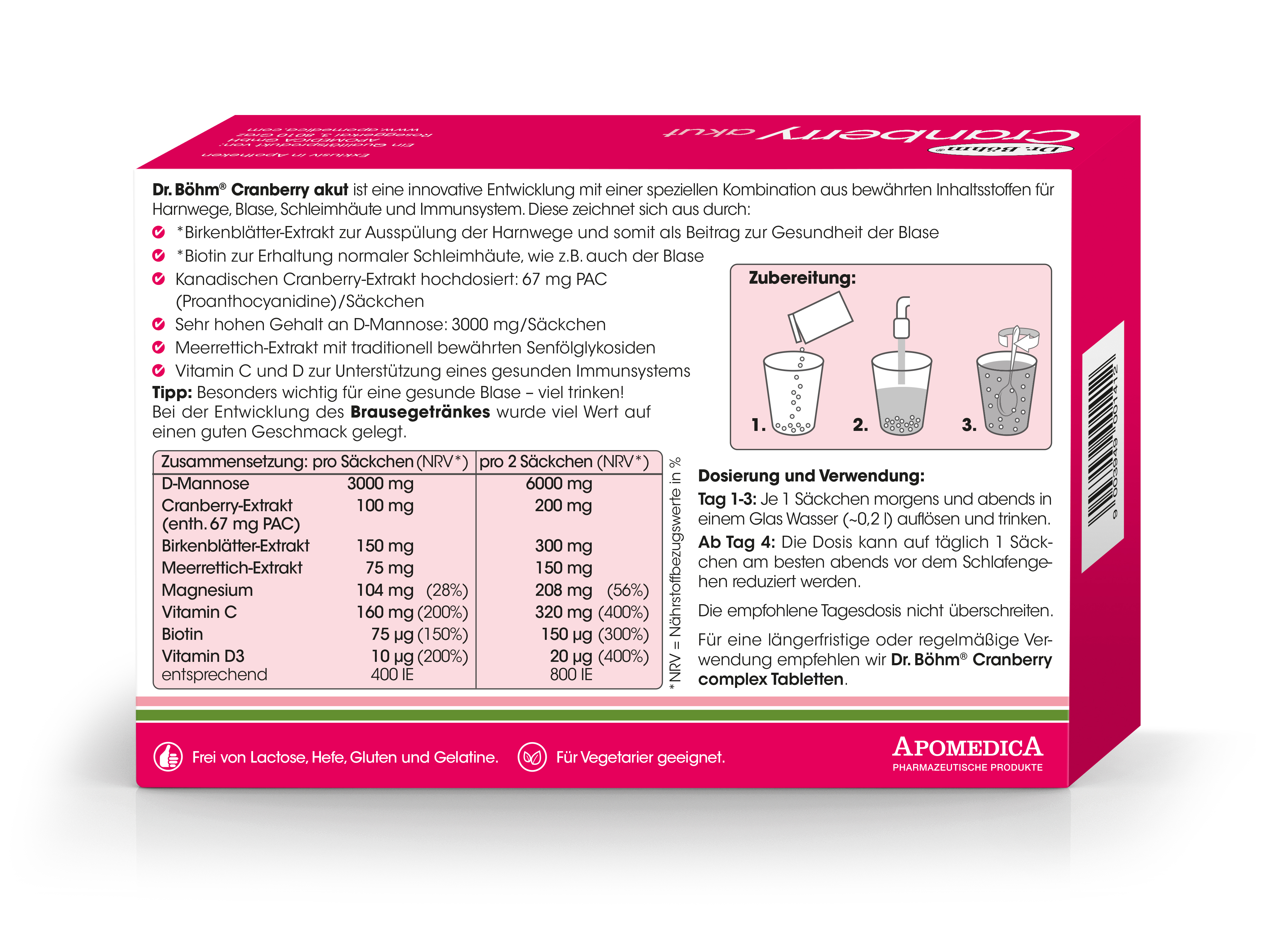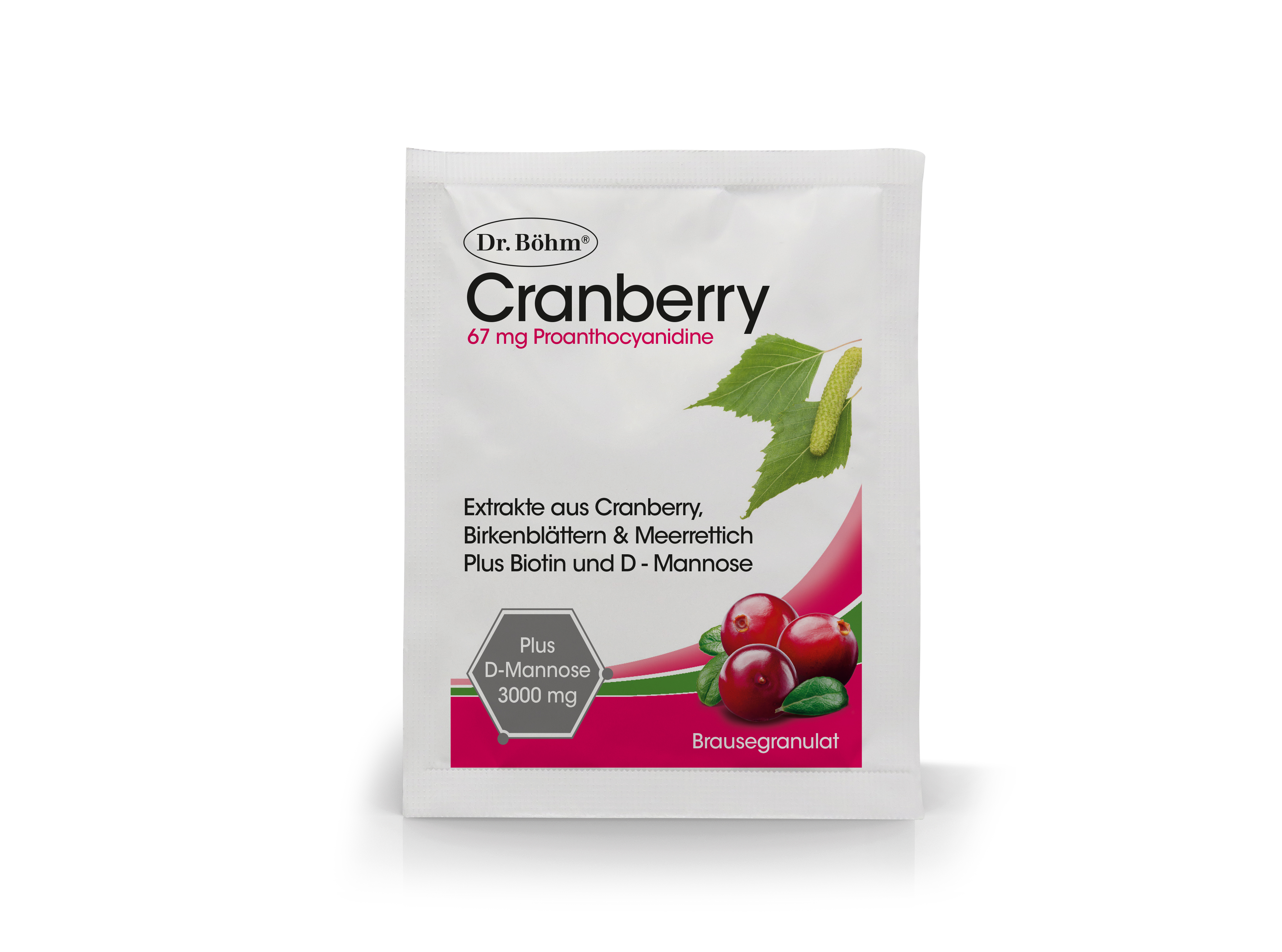 Biotin trägt zu einer gesunden Schleimhaut, wie z.B: auch der Blasenschleimhaut bei. Dank der einzigartigen Kombination von Proanthocyanidinen (PAC, bioaktive Cranberry-Wirkstoffe) von 67 mg/Säckchen und hochdosierter D-Mannose mit 3000 mg/Säckchen ist Dr. Böhm® Cranberry akut besonders effektiv.