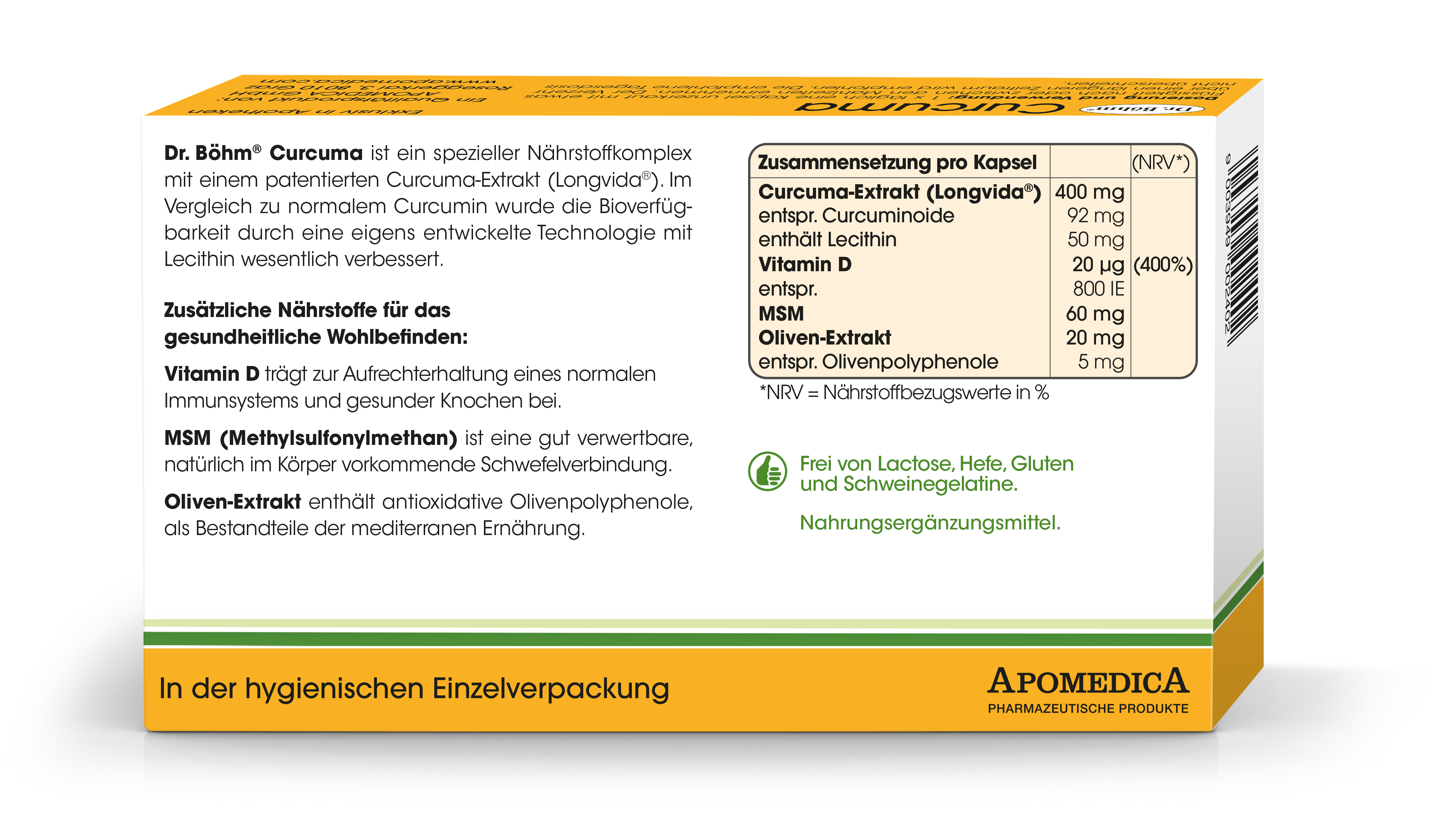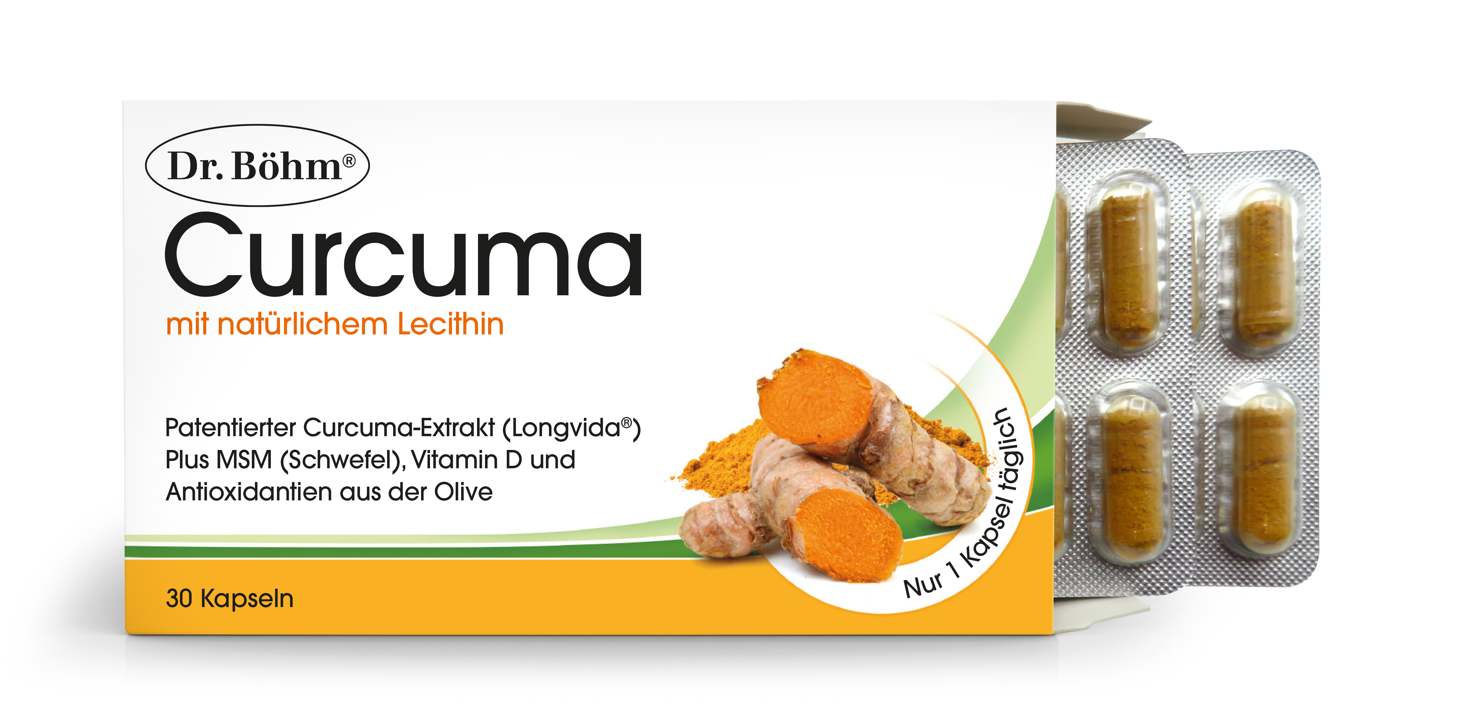 Dr. Böhm® Curcuma beinhaltet den patentierten Curcuma-Extrakt (Longvida®) optimal kombiniert mit Vitamin D für das Immunsystem sowie MSM (Schwefel) und Oliven Extrakt für Ihr gesundheitliches Wohlbefinden.